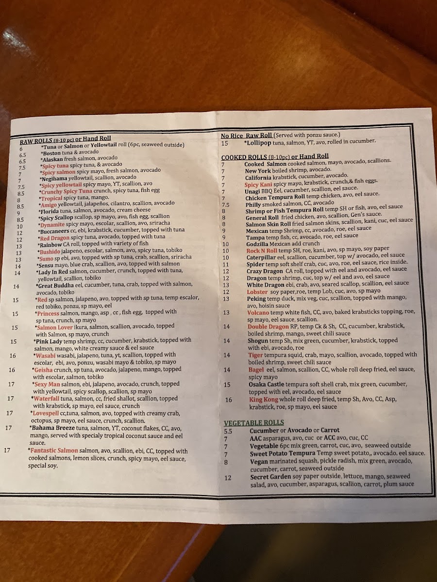 Jalapeño, escolar, salmon, avocado, spicy tuna, tobiko.